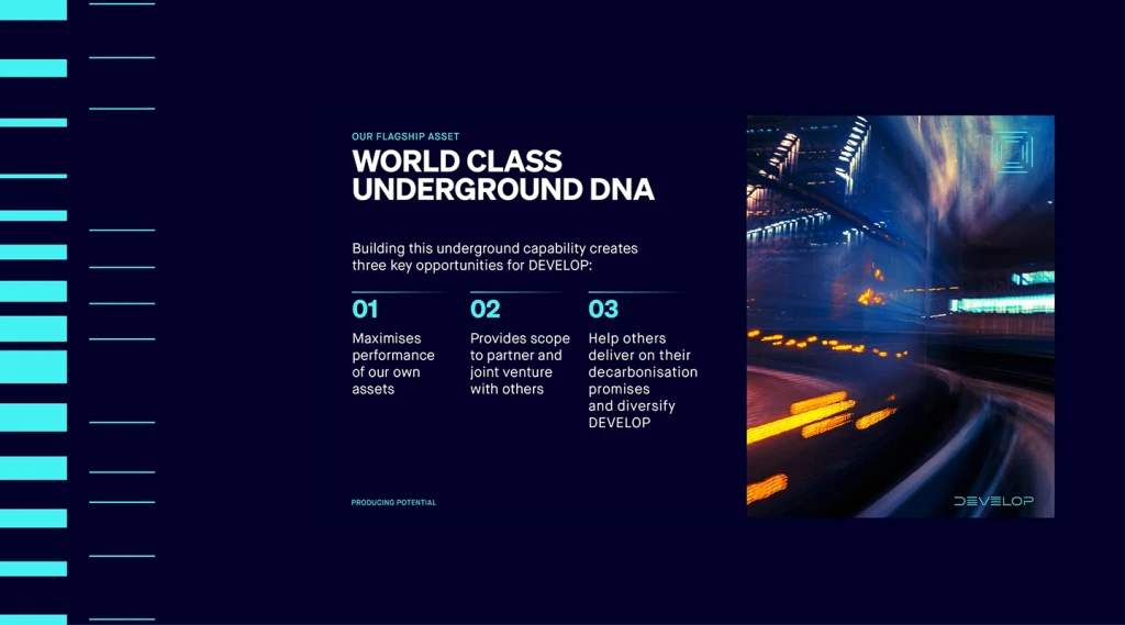 We designed a distinct wordmark that embodies Develop’s bold ambition and technological progress. It’s complemented by a toolkit of icons and graphic elements that convey constant motion. The striking colour palette is heroed with an electric blue, giving this next-generation resources company an edge in an otherwise mundane industry, while confident typography makes Develop’s powerful statements even more impactful.