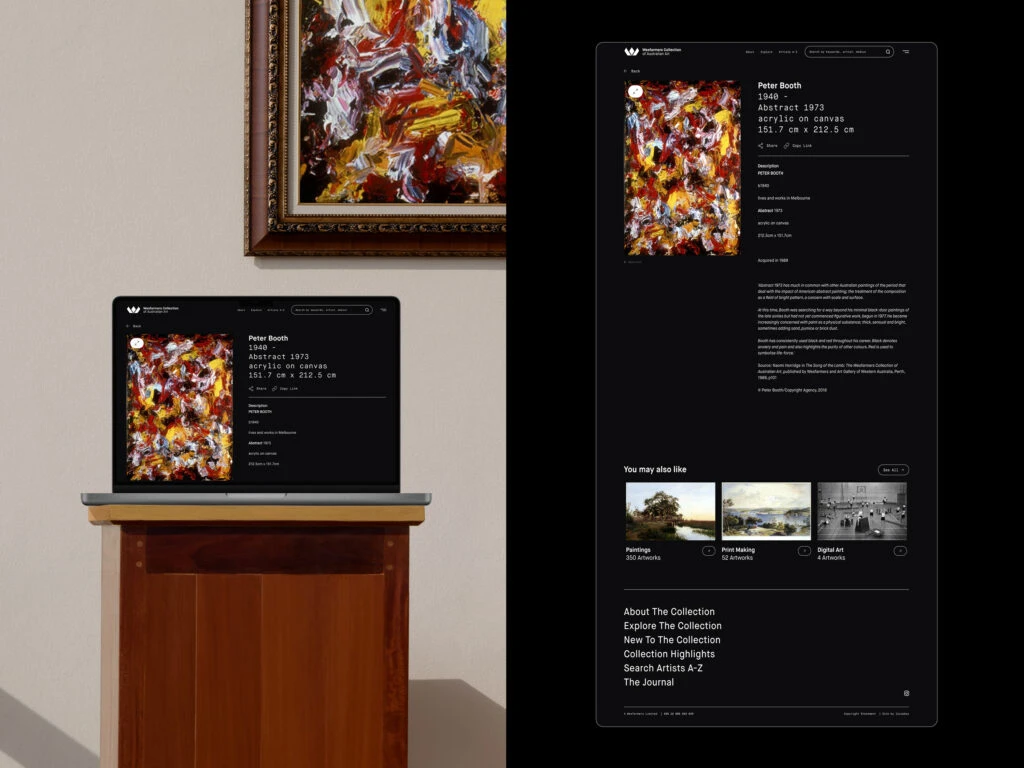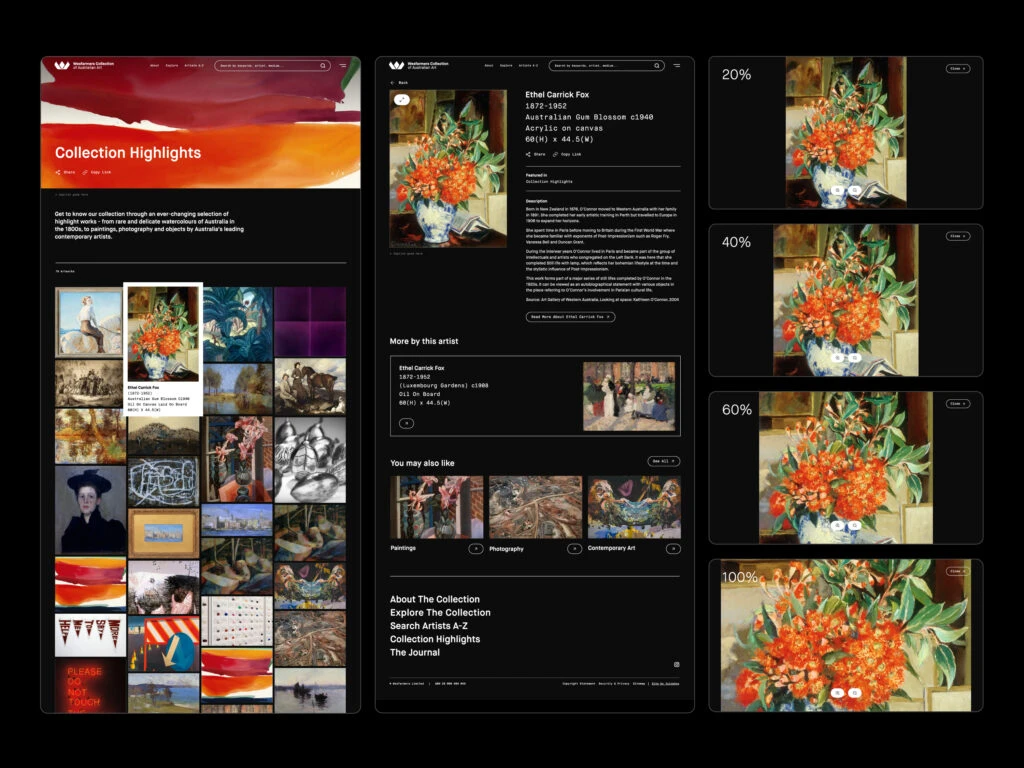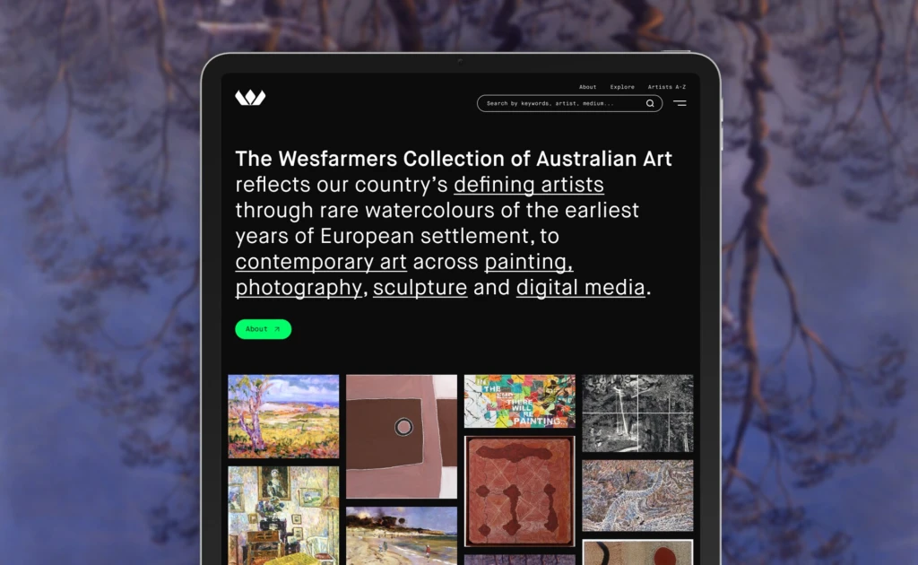 How do you create a compelling art gallery experience when COVID is keeping the world at home? We built a custom web solution featuring searchable pieces from The Wesfarmers Collection of Australian Art. A work of art in itself, it took a complete redesign of an outdated backend data management system, adding integrations to update the publicly viewable artworks on the newly designed wesfarmersart.com.au